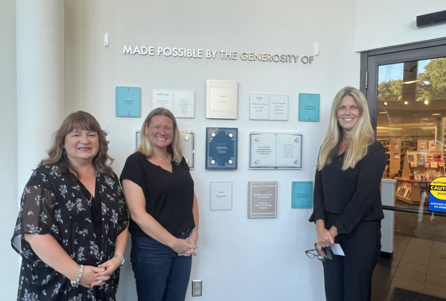 • (left to right) Dr. Megan Yore-Norbey, Library Foundation President, Jenny Cowan, Owner Griffin Tool, and Linda Stocker, Library Board Vice-President.